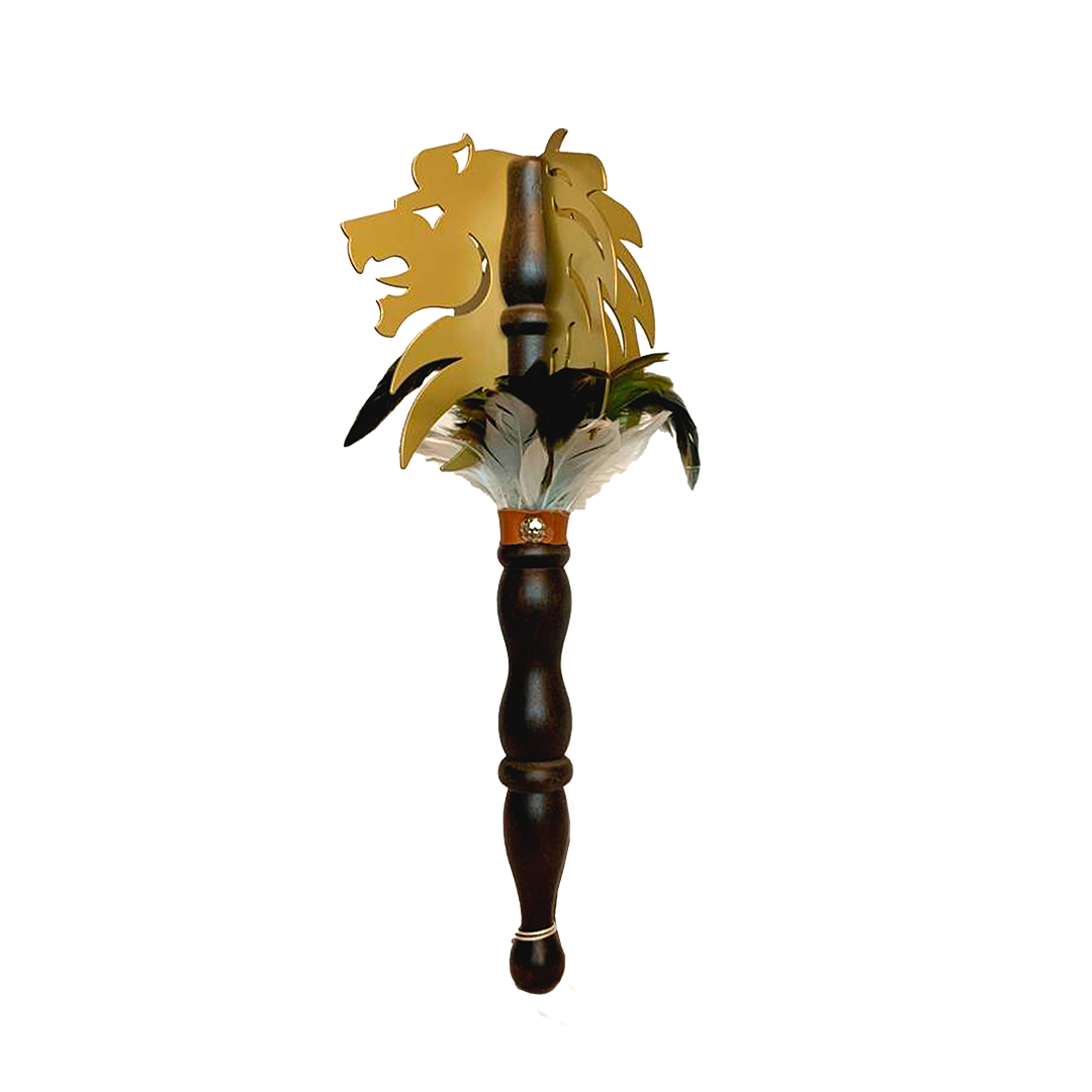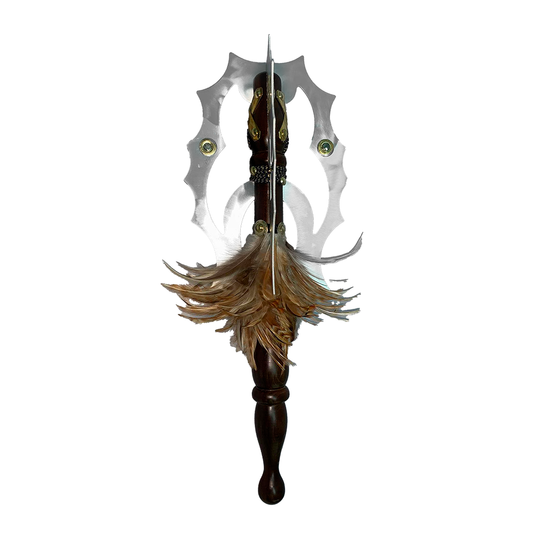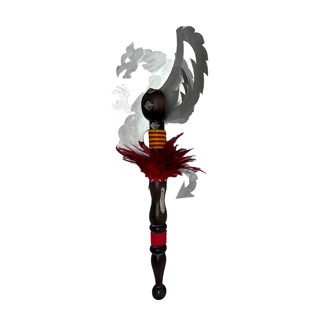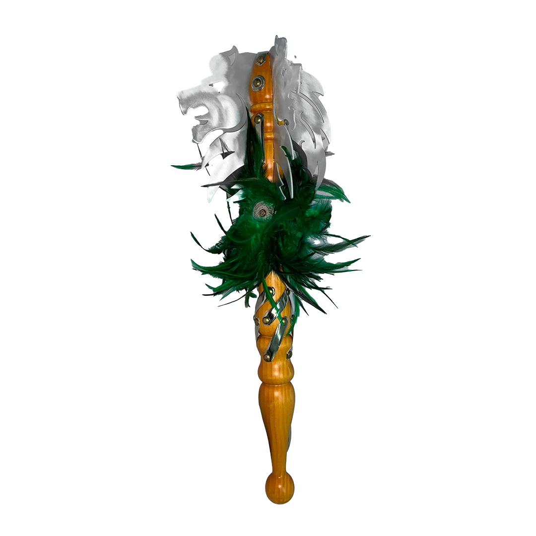 Porra con hojas de aluminio y base de madera con decoraciones a escoger. Ideal para comparsas de Moros y Cristianos, desfiles, decoración o regalo simbólico.